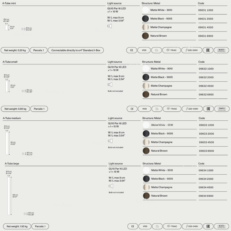 These tubes, with a diameter of six centimetres, are designed to accommodate GU10 bulbs, allowing you to choose the power and colour of the light.