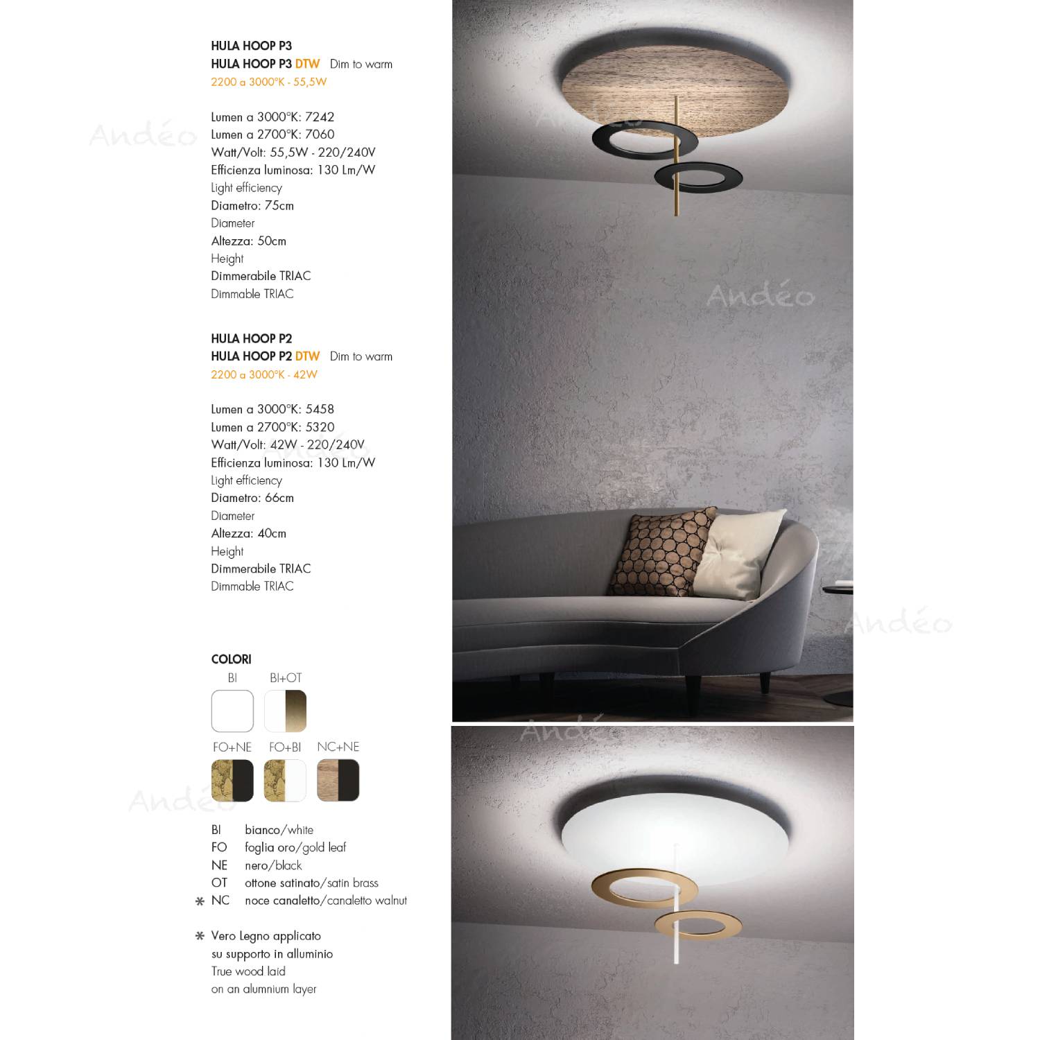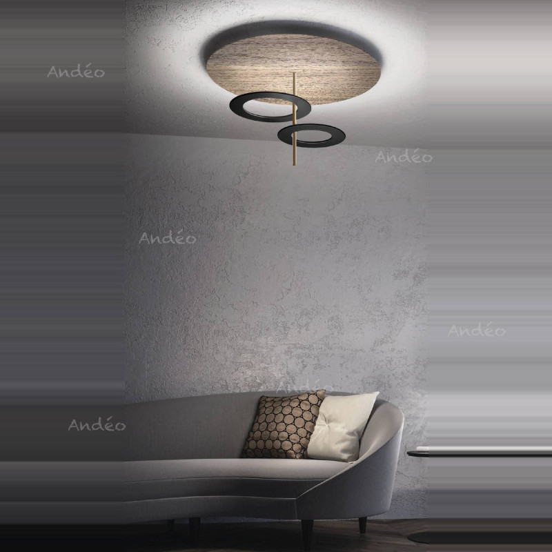 For finishes, you can choose different colors for the ceiling disc ("Disc") and for the rings ("Ring"). The NC finish is a wood veneer in Canaletto walnut applied to an aluminium disc.