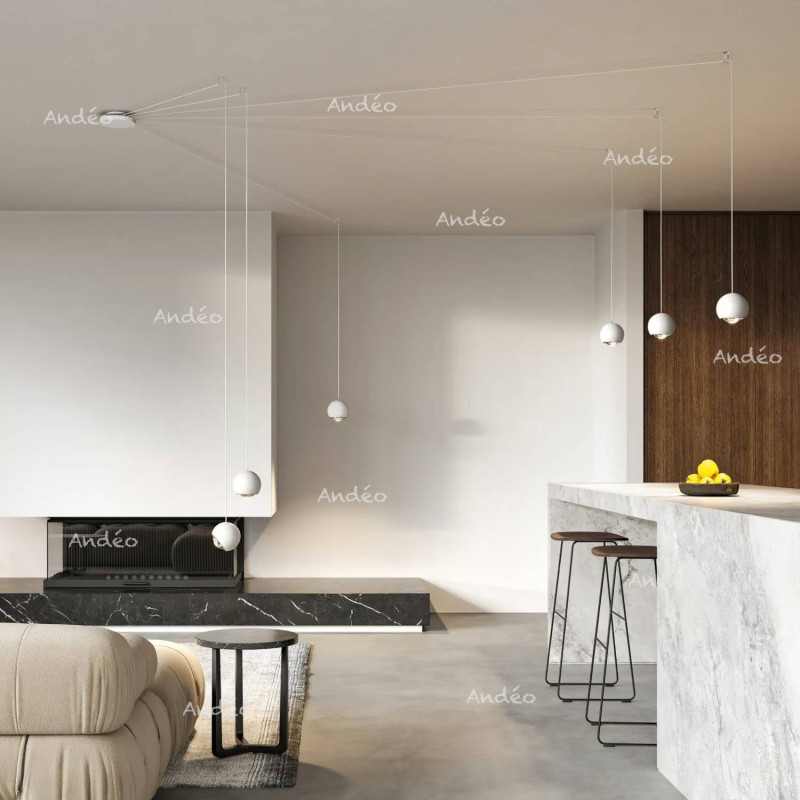 The Spider luminaire by Lodes is a pendant light in the shape of a sphere with a lens for diffusing LED light. This sphere tilts 90° and rotates 360°.