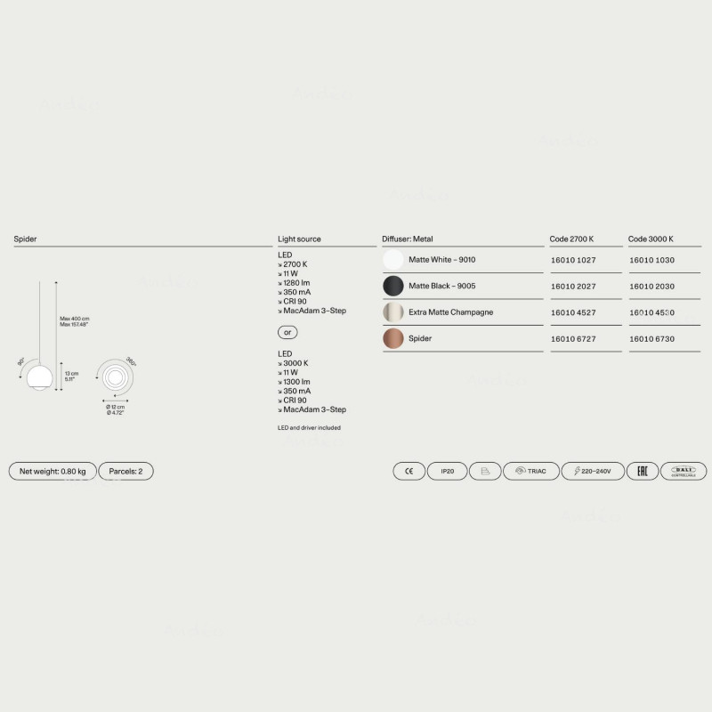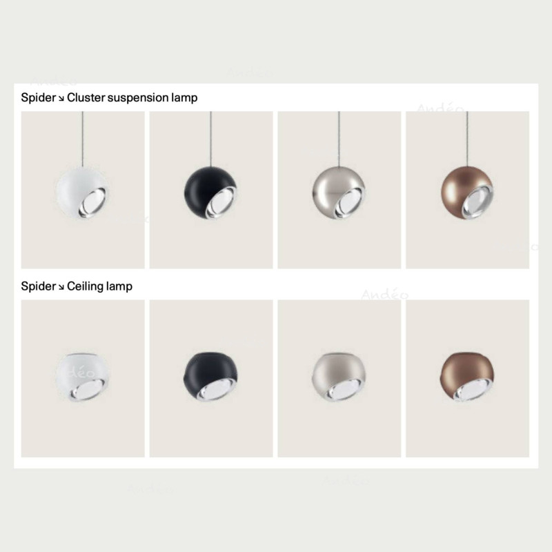 Lodes Spider is delivered without a ceiling mounting base, but you can choose your preferred base from the "Associated Products" section below. This LED light is available in warm white 2700°K or 3000°K, and in six colors: White, Black, Terra and Champagne.