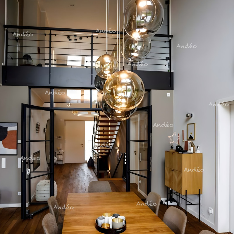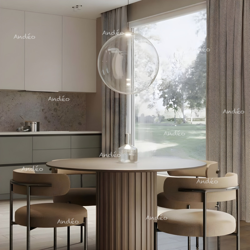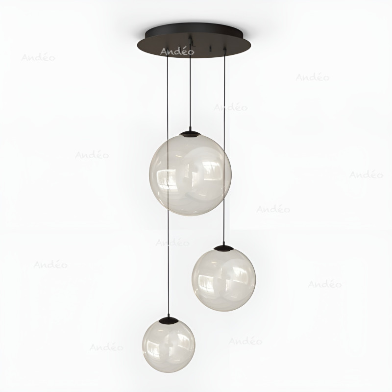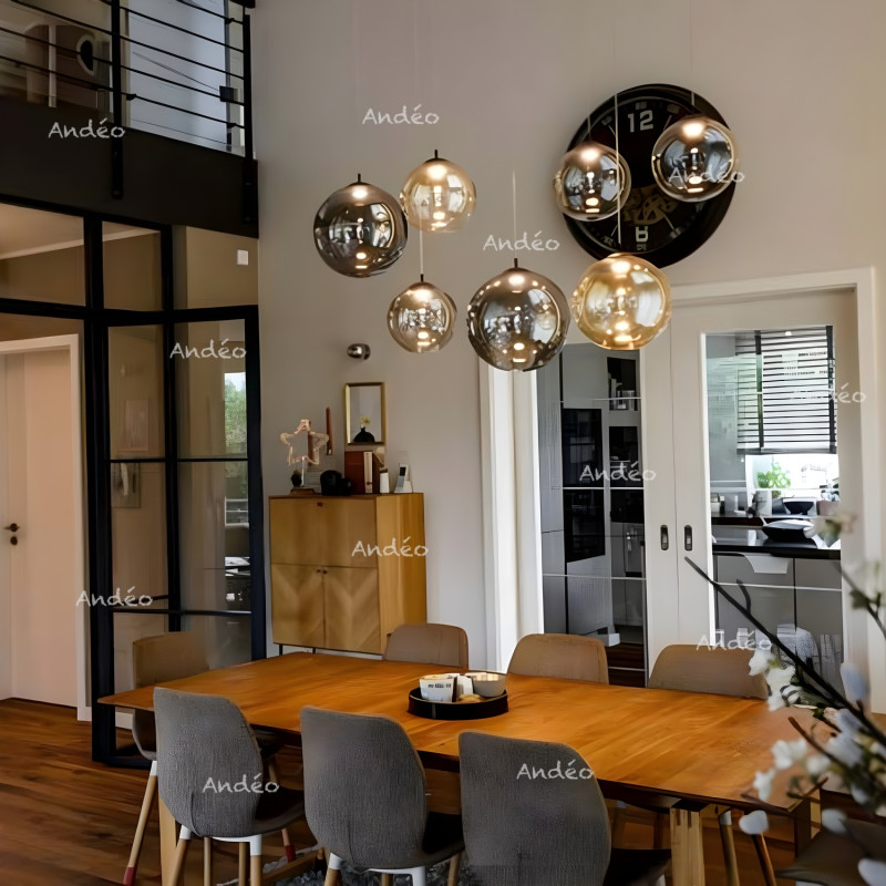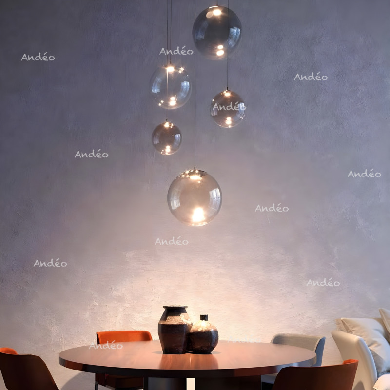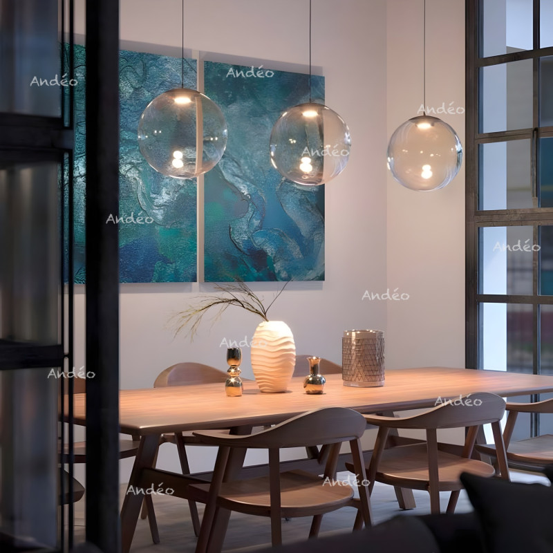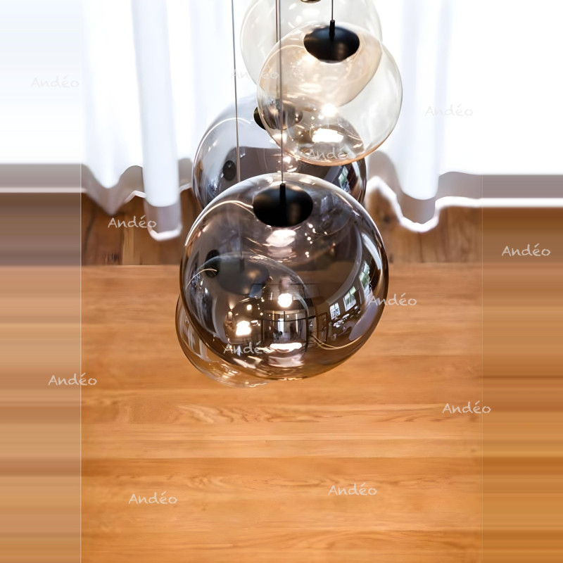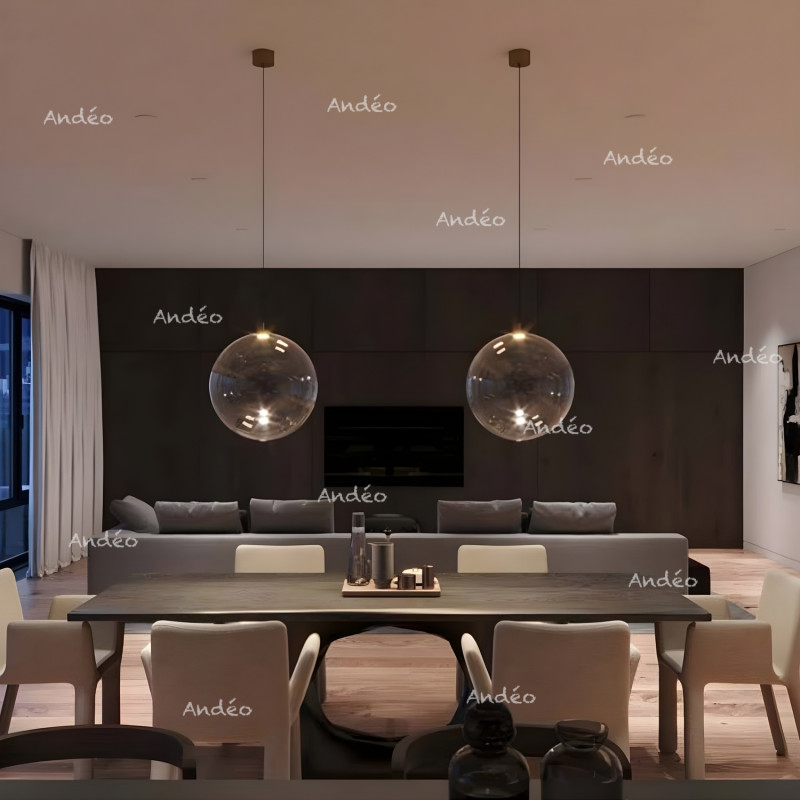 The completely round glass gently receives the light and diffuses it evenly throughout the space. Depending on the chosen finish, the suspension creates a different atmosphere — in the transparent version, the light is more vibrant and crystalline, while deeper shades offer a more intimate and warm illumination. The sphere acts like a luminous case, softening contrasts and giving the room a serene mood, ideal for relaxation areas as well as living spaces.