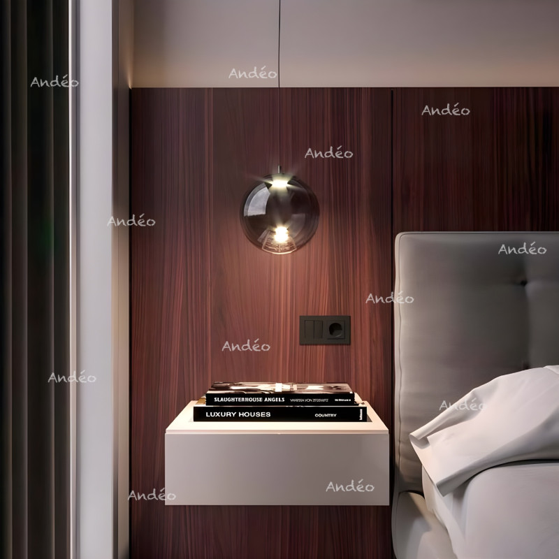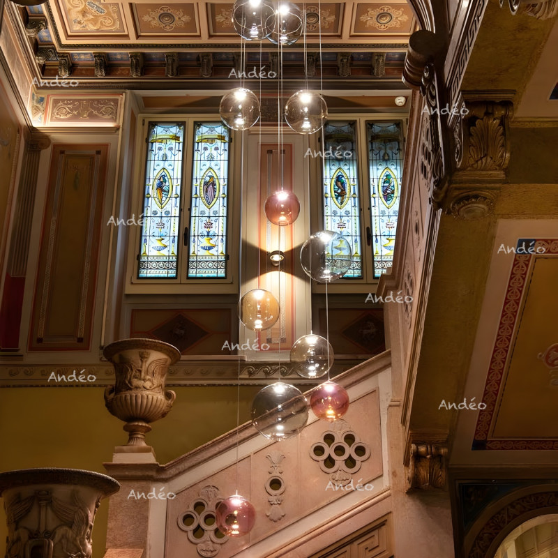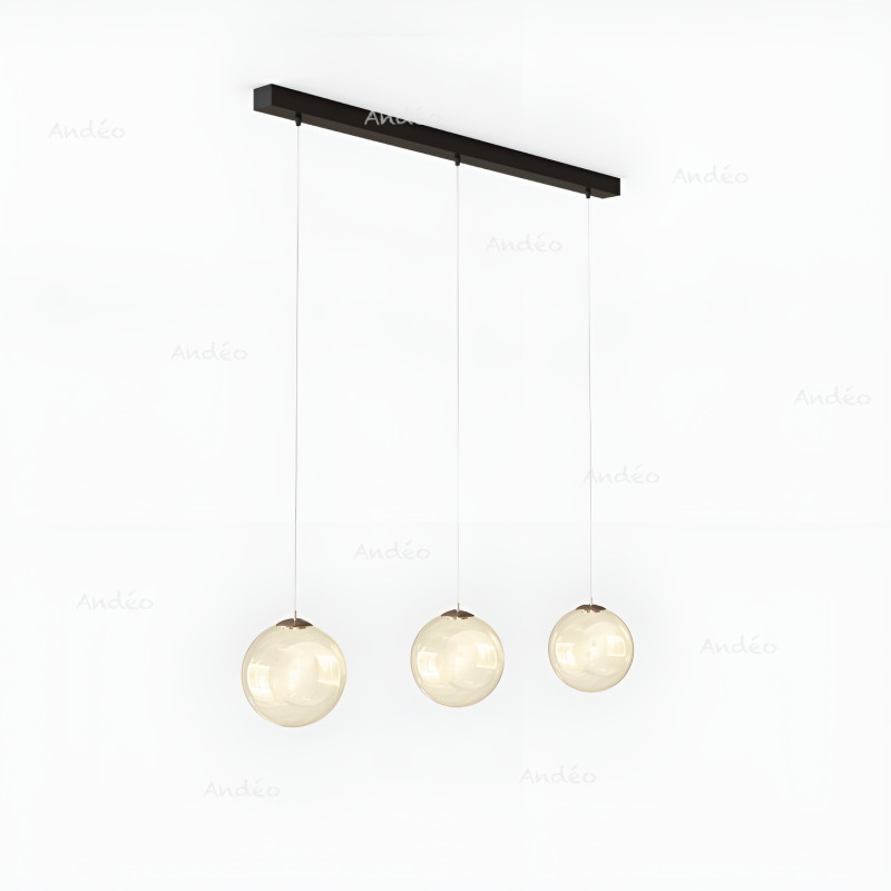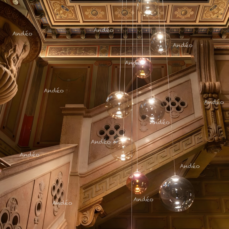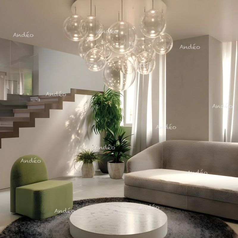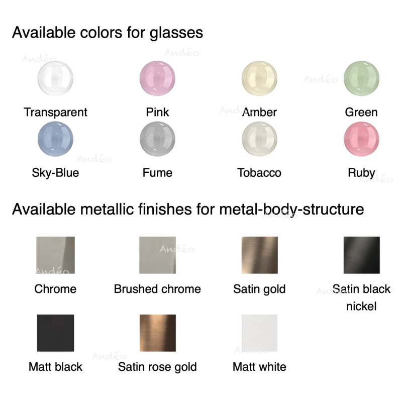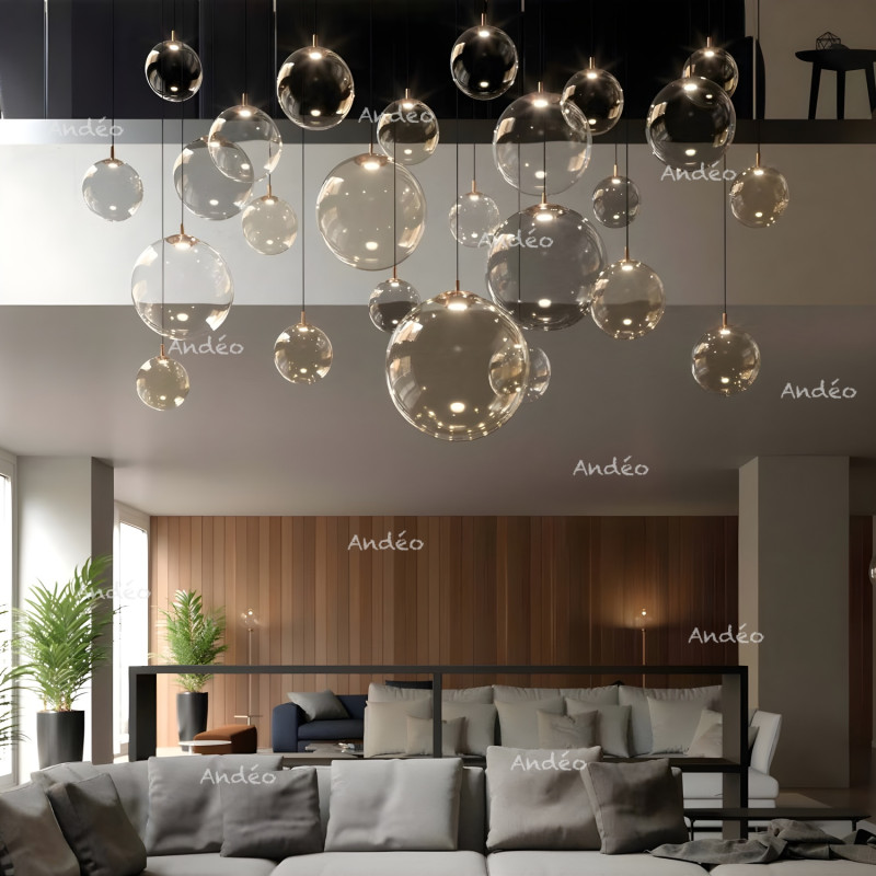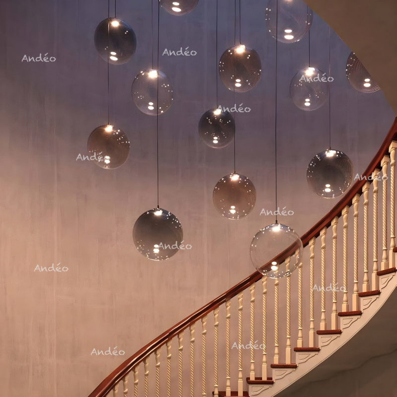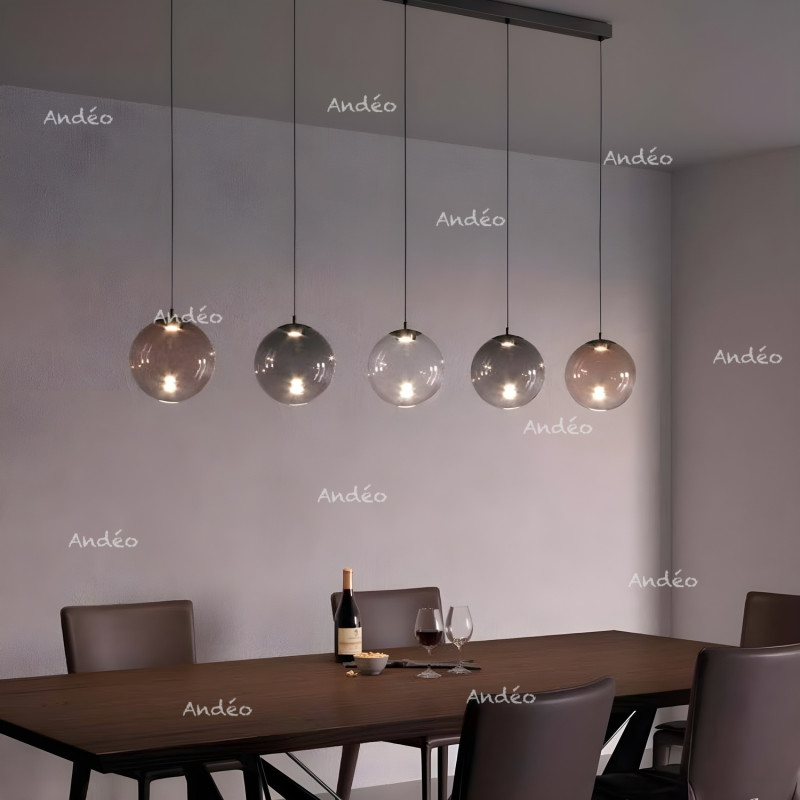 The completely round glass gently receives the light and diffuses it evenly throughout the space. Depending on the chosen finish, the suspension creates a different atmosphere — in the transparent version, the light is more vibrant and crystalline, while deeper shades offer a more intimate and warm illumination. The sphere acts like a luminous case, softening contrasts and giving the room a serene mood, ideal for relaxation areas as well as living spaces.