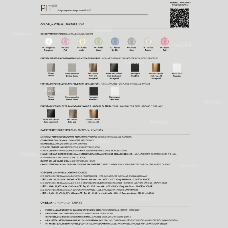 Cangini & Tucci Pit is available in 8 diffuser sizes, all equipped with a perfectly integrated LED, in 2700°K or 3000°K with CRI95. These light sources are dimmable with Triac, and Casambi and DALI options are also available.