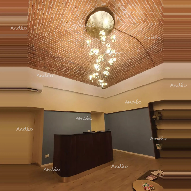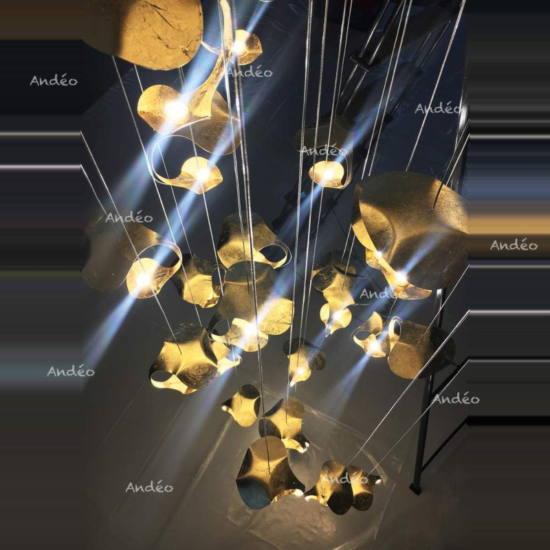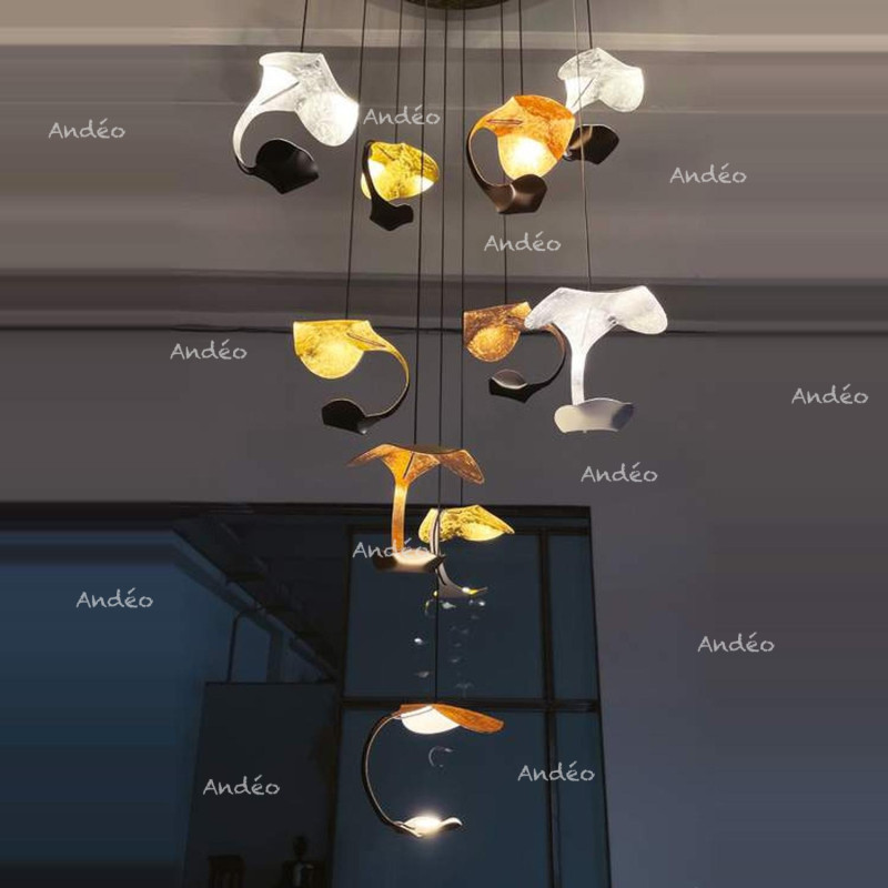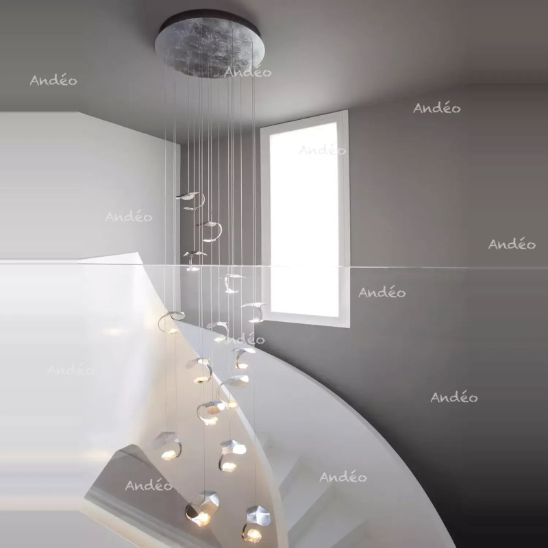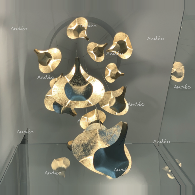 This cluster suspension naturally finds its place in a high-ceilinged hallway, above a staircase, in a contemporary living room or a hospitality space where a strong visual identity is desired. The range of finishes allows its character to be tailored — golden touches for a warm atmosphere, darker shades for a striking sculptural effect, or patinated tones reminiscent of raw, natural materials.