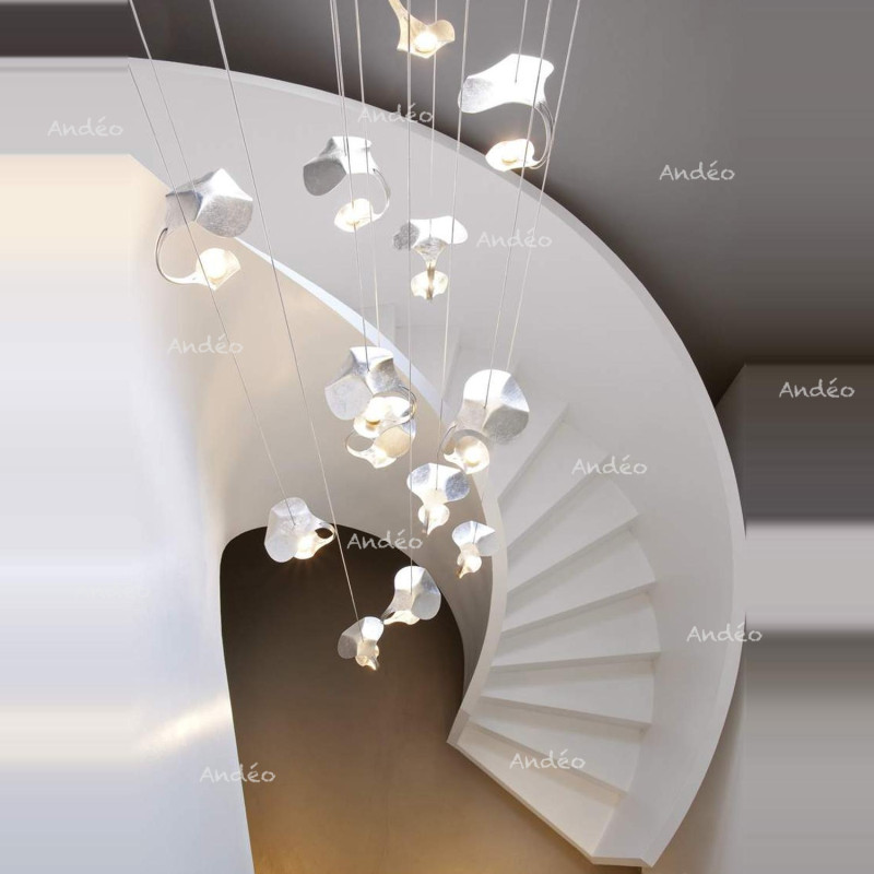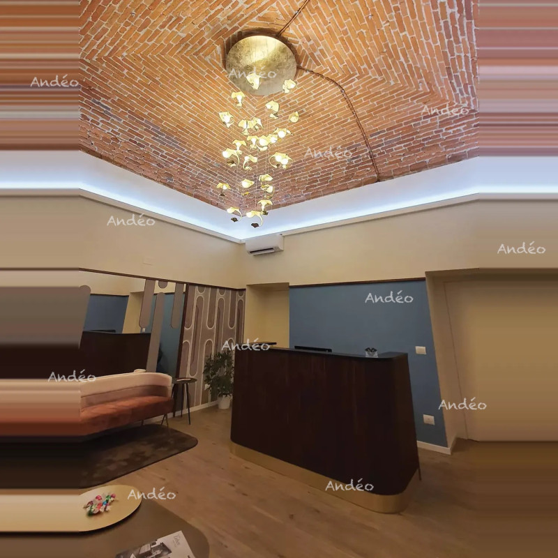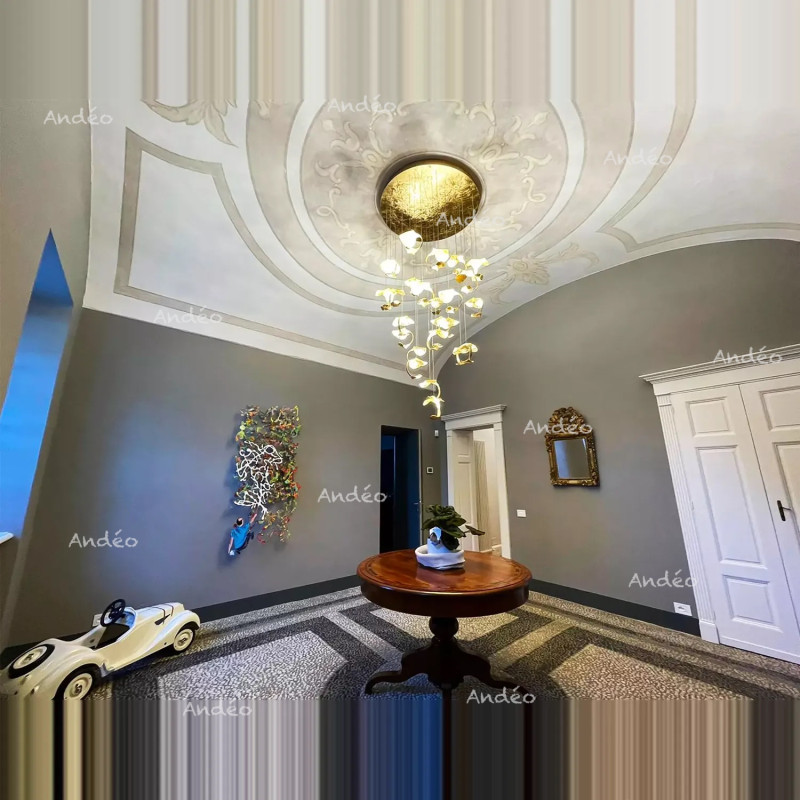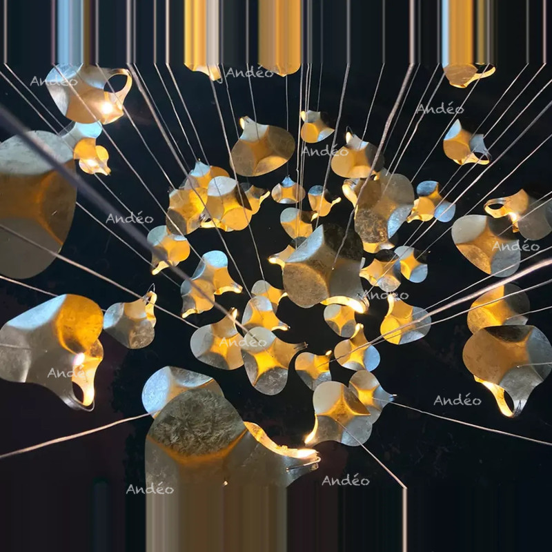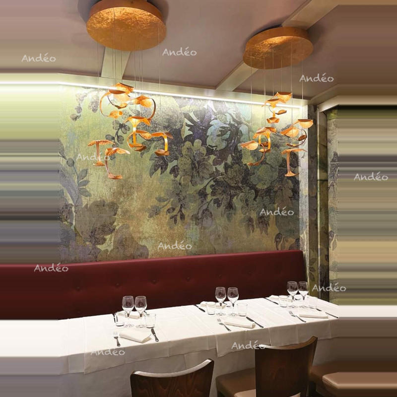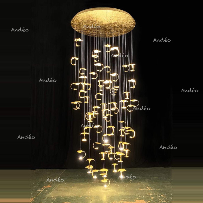This cluster suspension naturally finds its place in a high-ceilinged hallway, above a staircase, in a contemporary living room or a hospitality space where a strong visual identity is desired. The range of finishes allows its character to be tailored — golden touches for a warm atmosphere, darker shades for a striking sculptural effect, or patinated tones reminiscent of raw, natural materials.