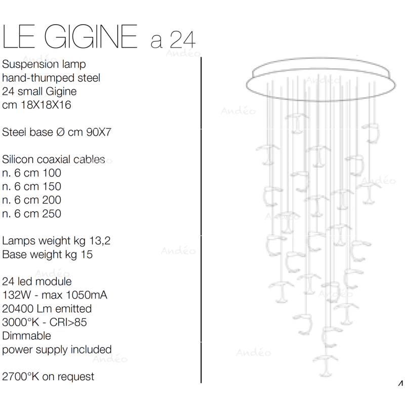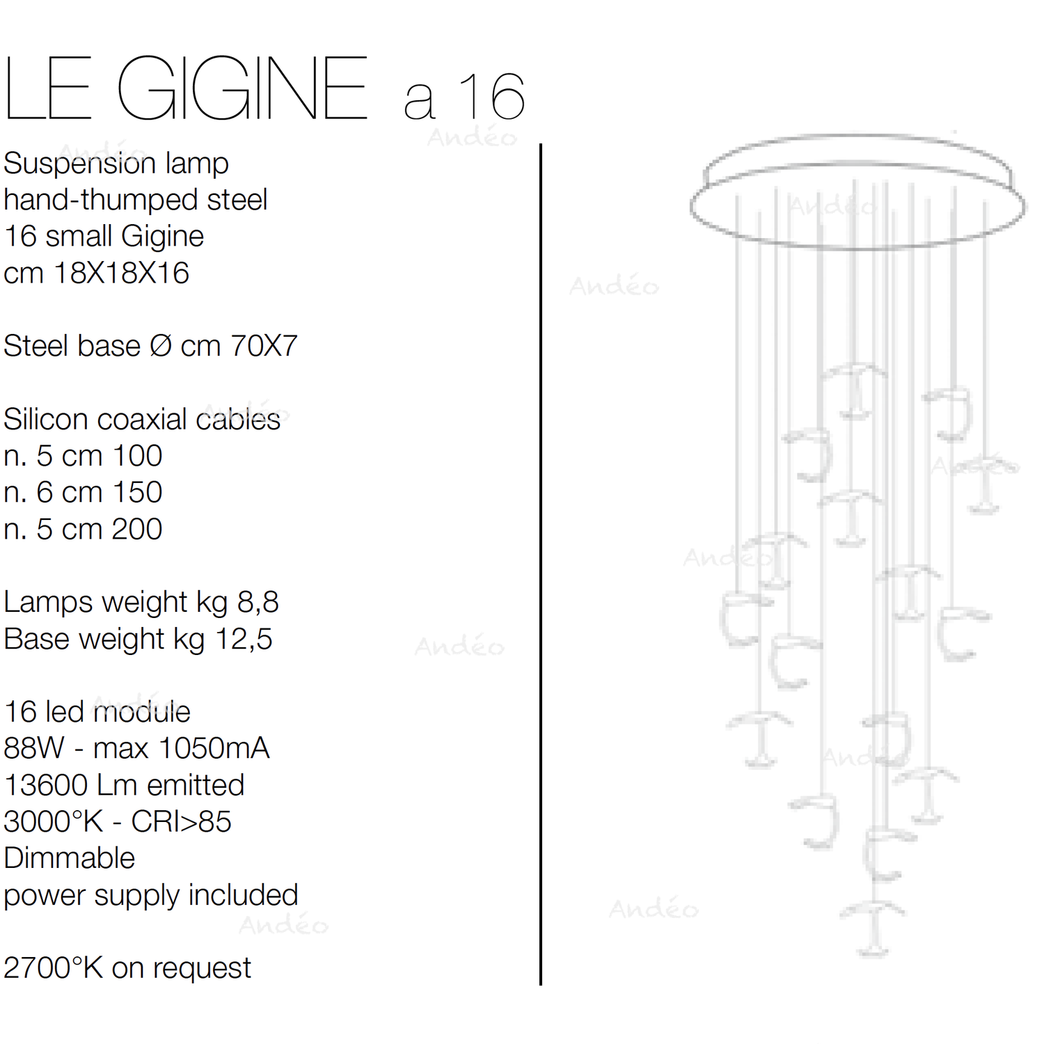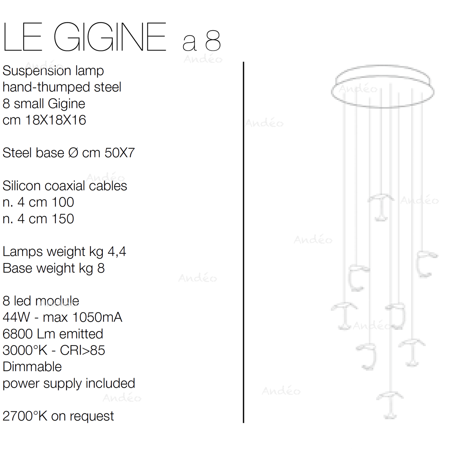 In its chandelier version, Le Gigine becomes a true light choreography. Available as standard in 8, 16 or 24 lamp versions, it unfolds in space like a cascade of suspended elements, each following its own trajectory. The composition can appear delicate and intimate or majestic and spectacular, depending on the cable length and chosen density. Its floating silhouettes create a rain of light, a shifting light landscape to be admired as much as it illuminates.