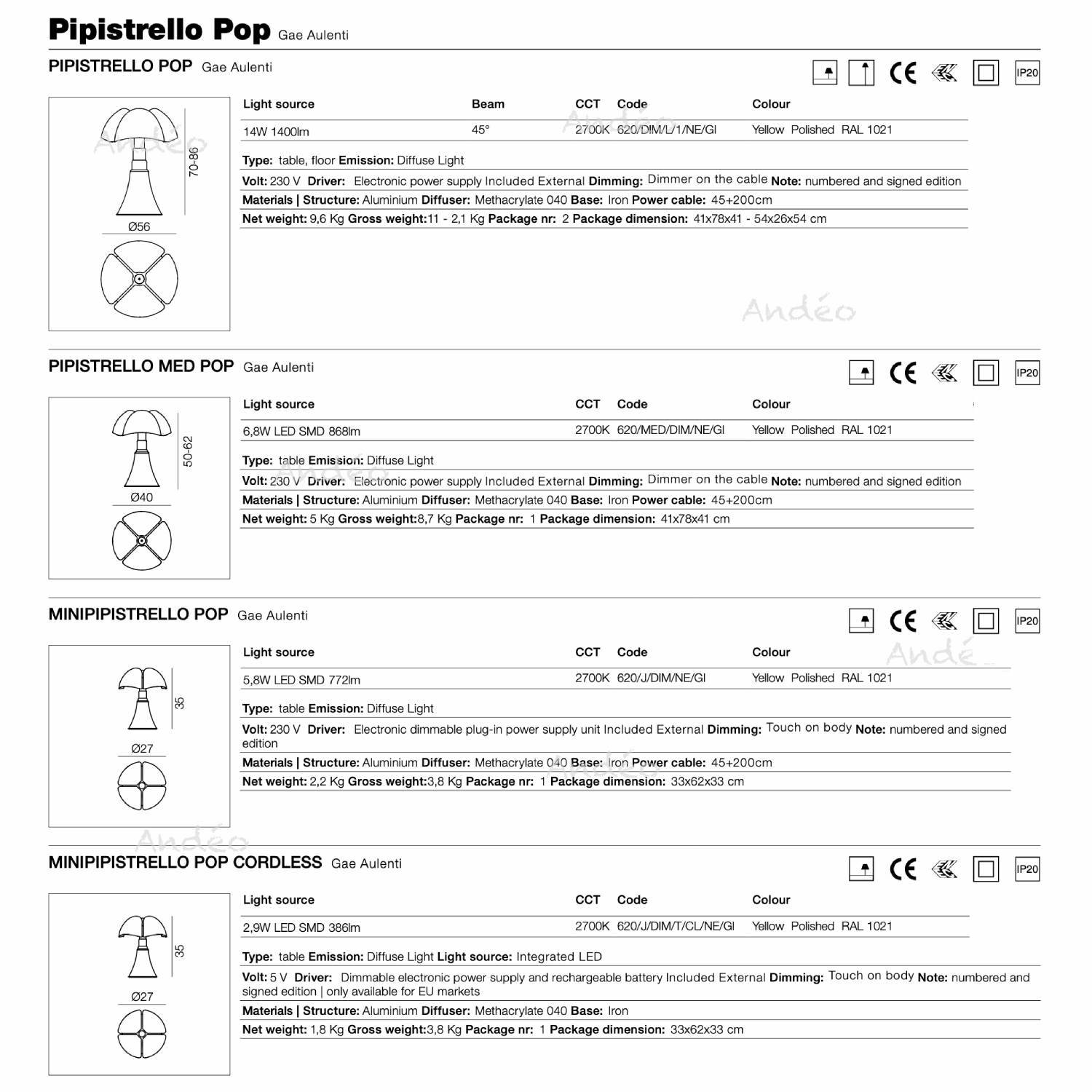 La famille Martinelli Luce Pipistrello Pop se décline en plusieurs modèles, la grande version avec sa hauteur réglable de 70 à 86 cm, la medium également réglable en hauteur entre 50 et 62 cm, et les versions mini avec une hauteur fixe de 35 cm. Toutes ces versions sont en led intégré blanc chaud 2700°K et fonctionnant en branchant la lampe dans une prise électrique.