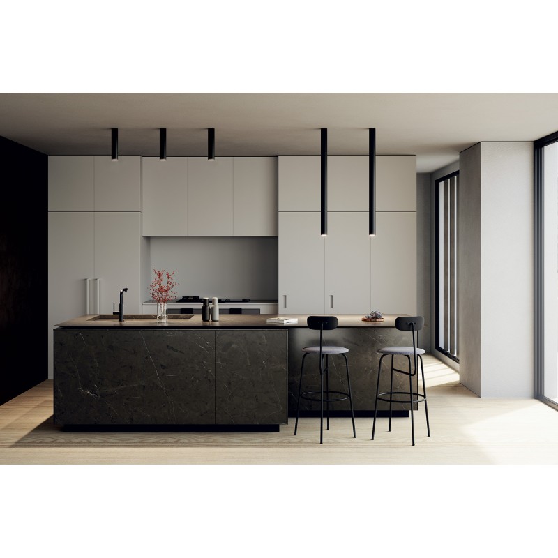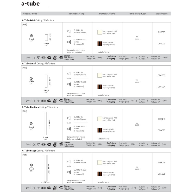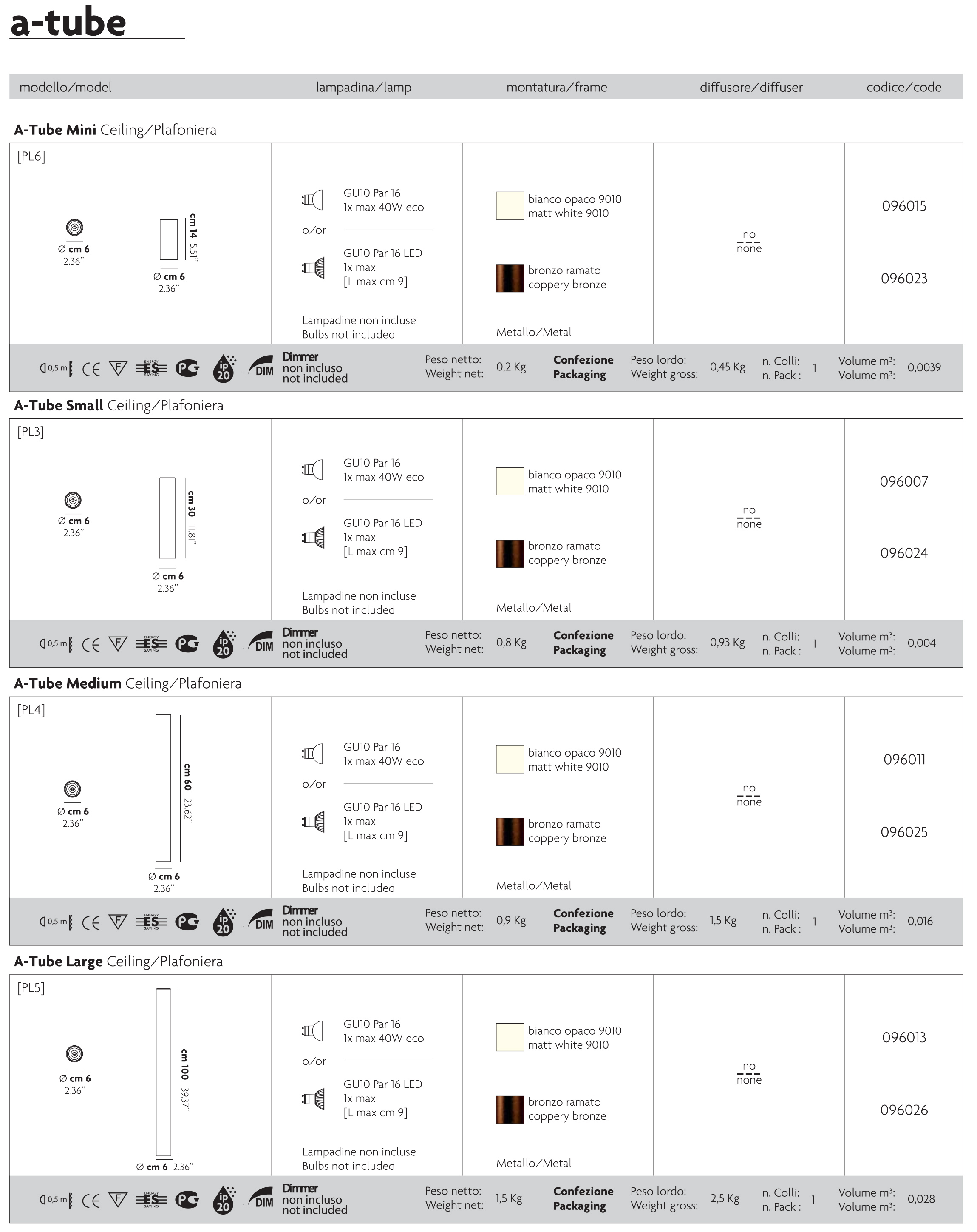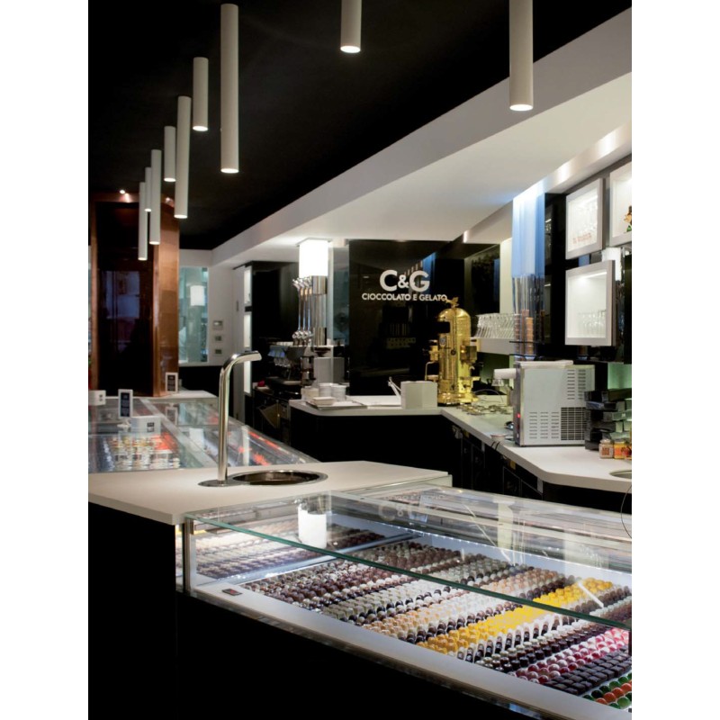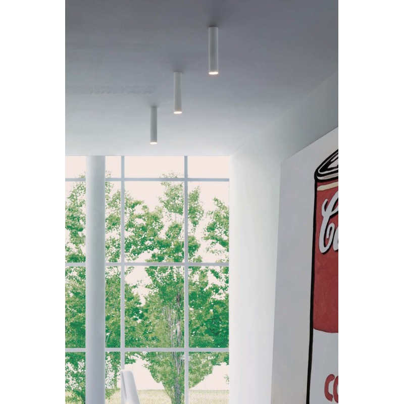 Voici la version à fixer au plafond du luminaire Lodes A-Tube. Ce tube lumineux existe en quatre longueurs, en blanc, noir ou bronze cuivré. Cet éclairage accepte le led avec des ampoules à soquet GU10.