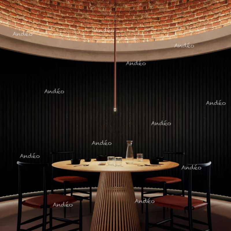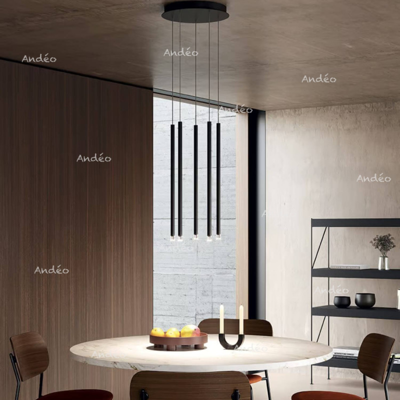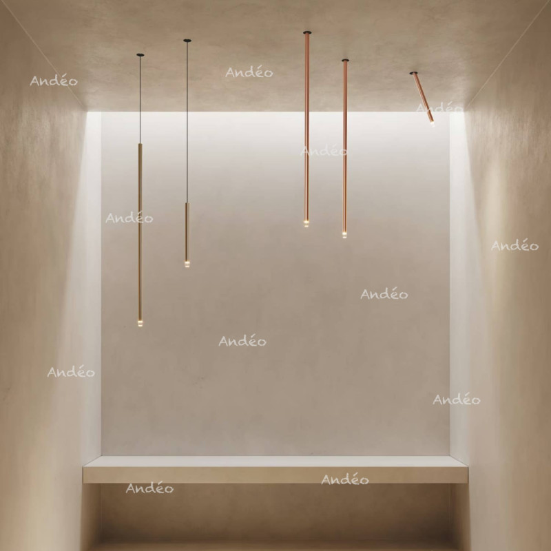 A-Tube Nano du fabricant Italien de luminaires Lodes est une collection de fins tubes en suspension avec à l'extrémité basse un éclairage led avec un diffuseur transparent. Les tubes existent en 4 longueurs, Small 30cm, Medium 60 cm, Large 90 cm et XL 120 cm. Ceux-ci sont disponibles en 4 coloris, Noir, Champagne, Or et Terra
