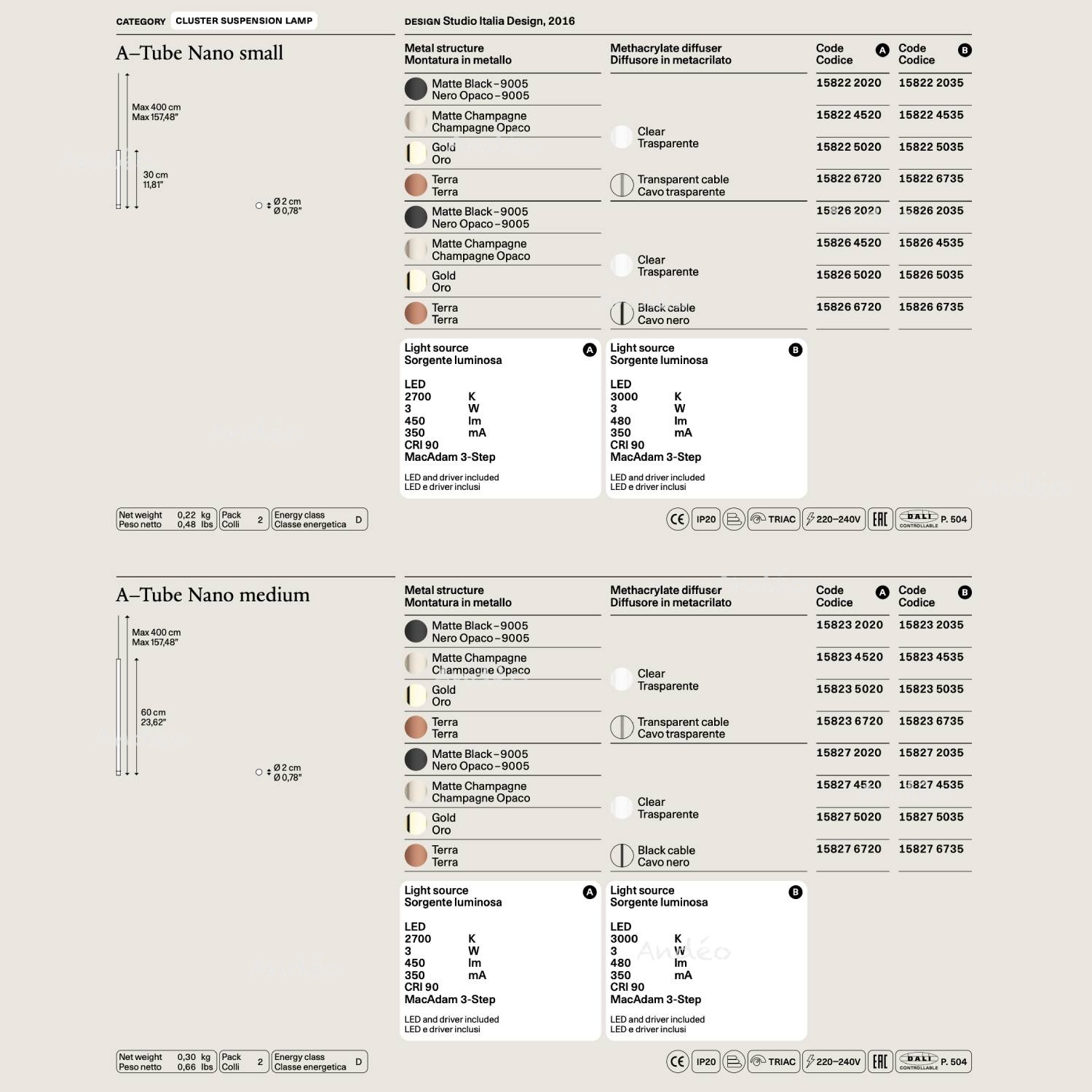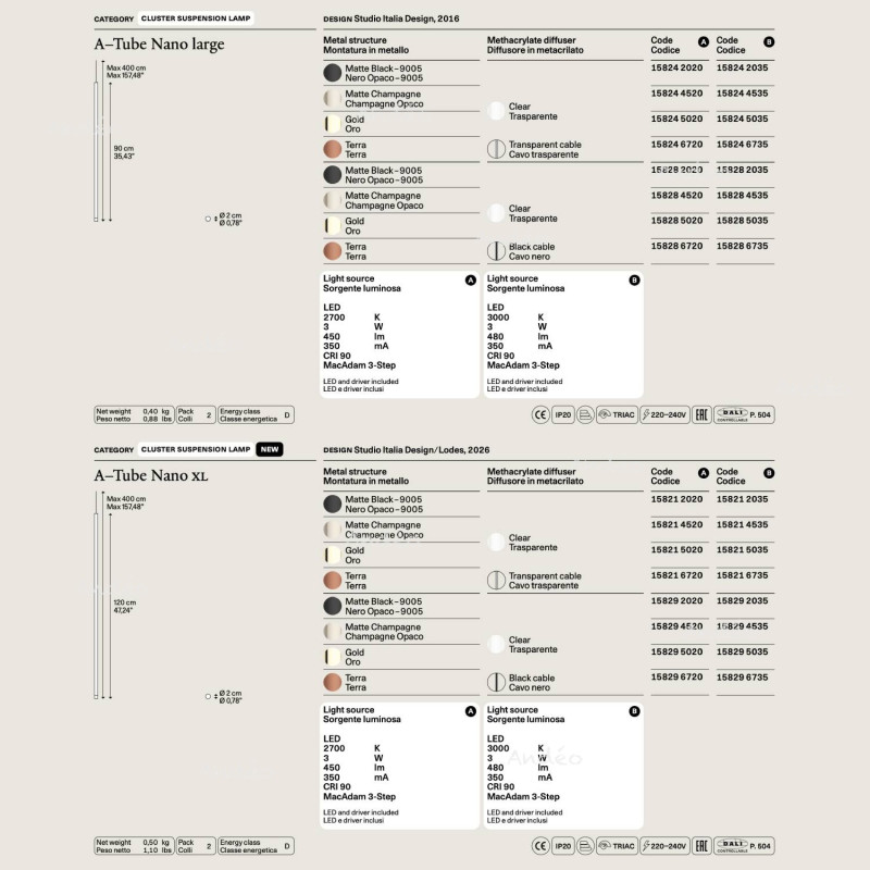 Lodes A-Tube Nano est vendu à l'unité sans base. Pour créer un lustre avec plusieurs tubes vous pouvez le composer en additionnant les tubes dans votre panier.