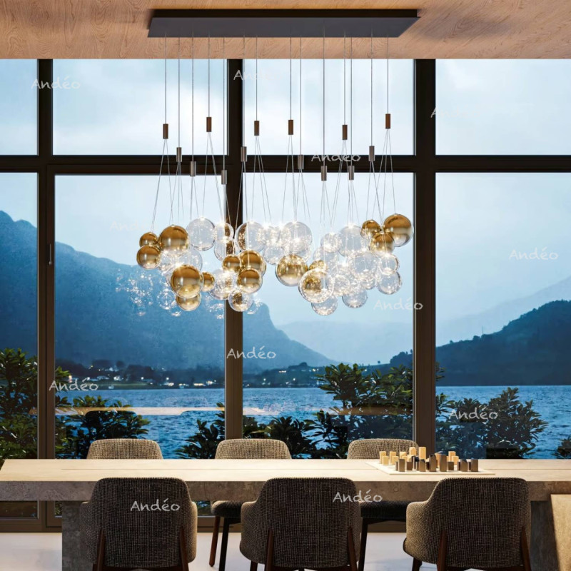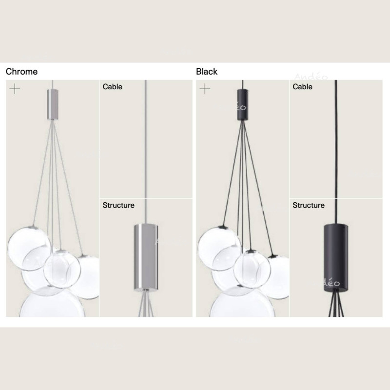 Lodes Random est une suspension réalisée avec 3 bulles de verre de diamètres différents suspendus à un câble réglable en hauteur. Ces différentes boules de verre sont équipées chacune d'un éclairage en led.