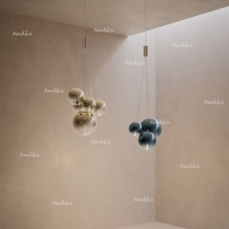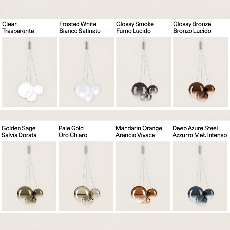 Lodes Random est disponible en différents coloris de verre, Clear, Frosted white, Glossy smoke, Pale Gold, Glossy Bronze, Mandarin orange, Golden sage et Deep azure steel. Sur ces suspensions, la couleur du verre est très prononcée sur la partie haute de la boule et moins en bas pour mieux laisser passer la lumière, le tout ponctué d'un joli effet dégradé entre les deux.