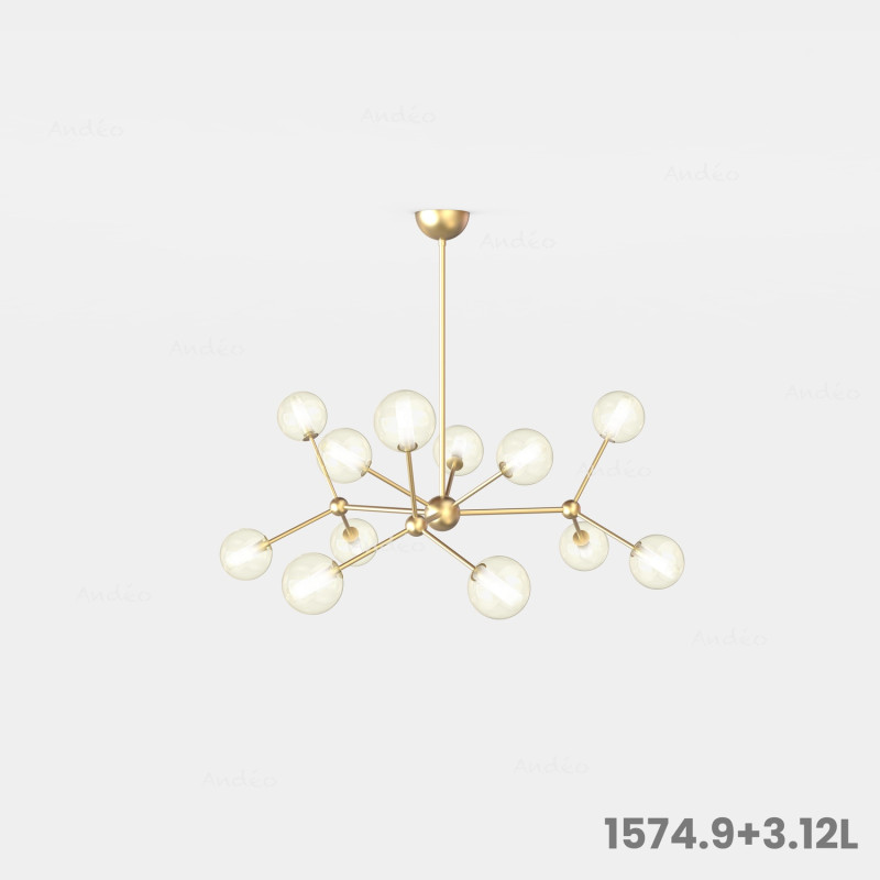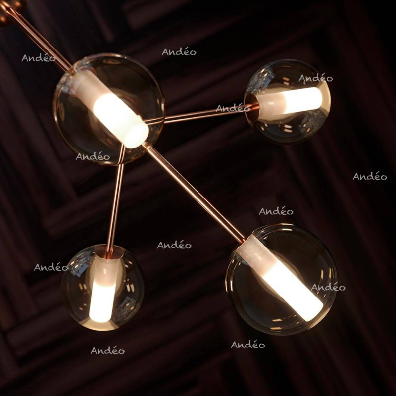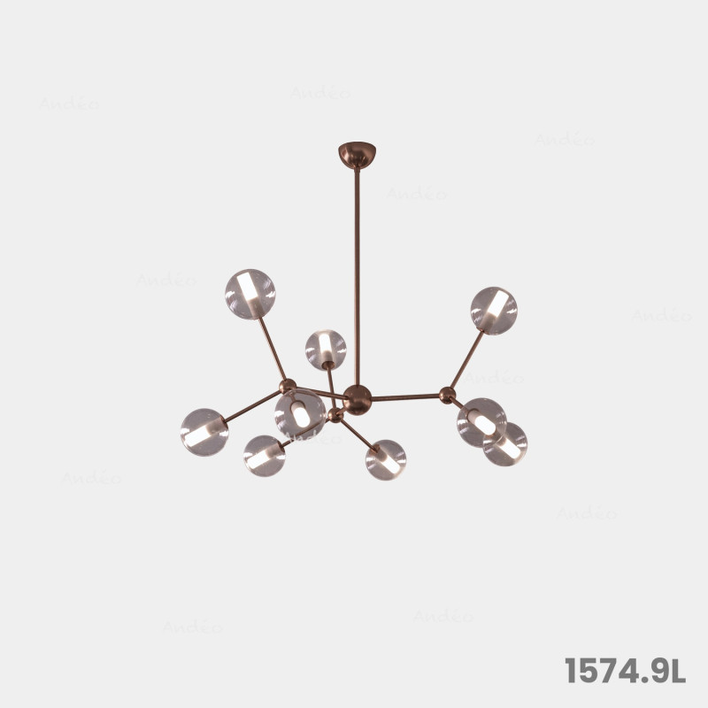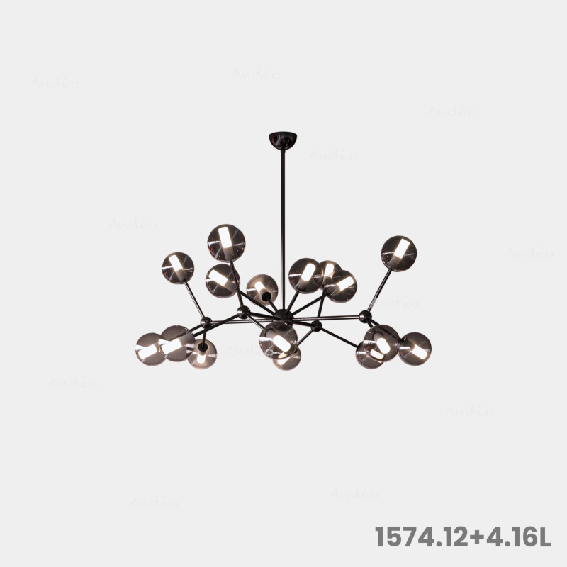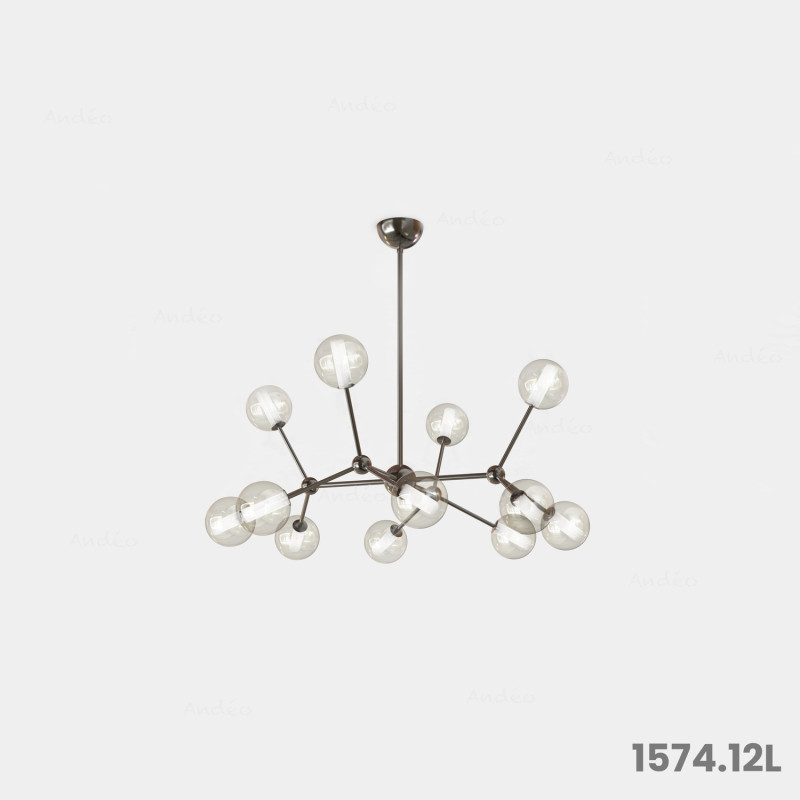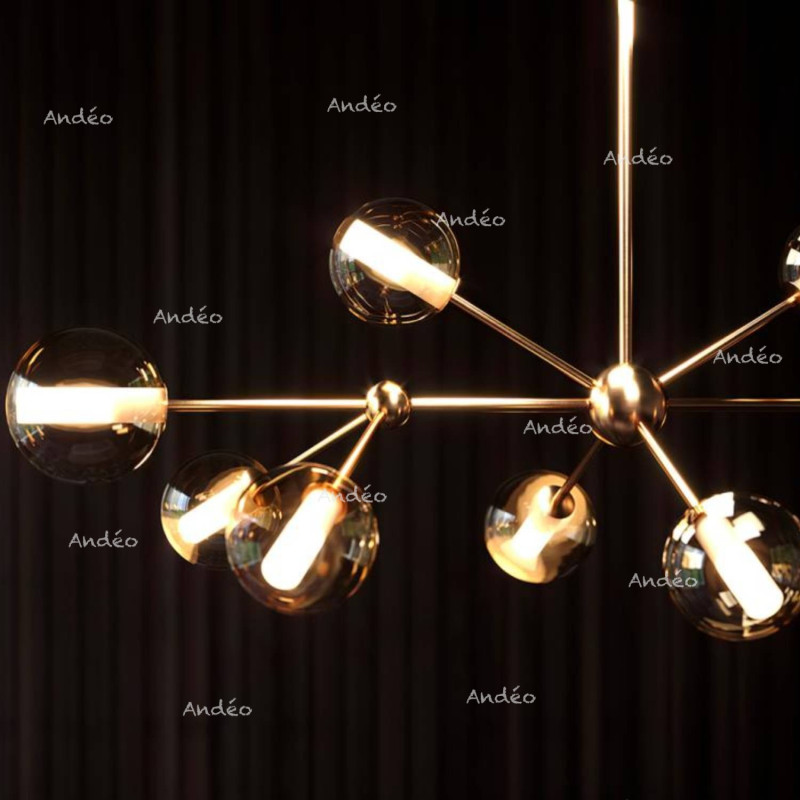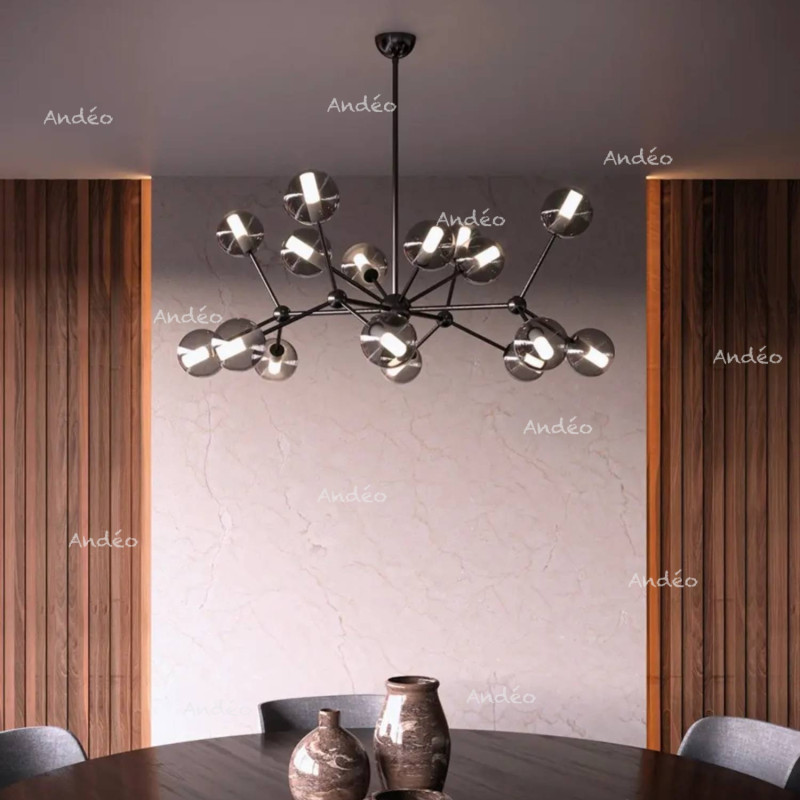 La suspension Mirea du fabricant de luminaires italien Cangini & Tucci s’impose comme une pièce sculpturale, construite autour d’une structure métallique ramifiée qui évoque une constellation ou une composition moléculaire. Cette architecture graphique sert d’écrin à plusieurs diffuseurs en verre soufflé, chacun façonné artisanalement, qui ponctuent la structure comme autant de capsules lumineuses. L’ensemble forme un luminaire contemporain au caractère affirmé, pensé pour devenir un élément central de la décoration.