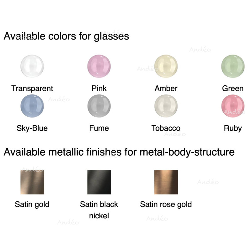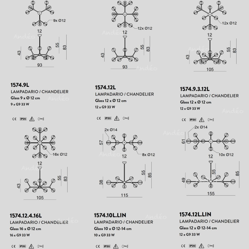 Cangini & Tucci Mark se décline en 6 formats de luminaires, tous sont équipés d'une certaine quantité de globes en verre, avec dans chaque verre un soquet pour ampoule G9. La structure en métal est disponible en différents coloris, ainsi que les verreries.