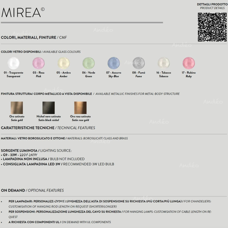 La gamme Mirea existe en plusieurs versions, avec différentes tailles et compositions, ce qui permet d’adapter la suspension à des volumes très variés. Les finitions du métal et les teintes du verre offrent un véritable travail sur les contrastes, allant d’une esthétique plus technique à une interprétation plus chaleureuse selon les coloris choisis. Les modèles multi-branches permettent de créer une installation spectaculaire dans un salon, un hall ou une cage d’escalier, tandis qu’une version plus compacte conviendra parfaitement à une table de repas ou à un bureau.