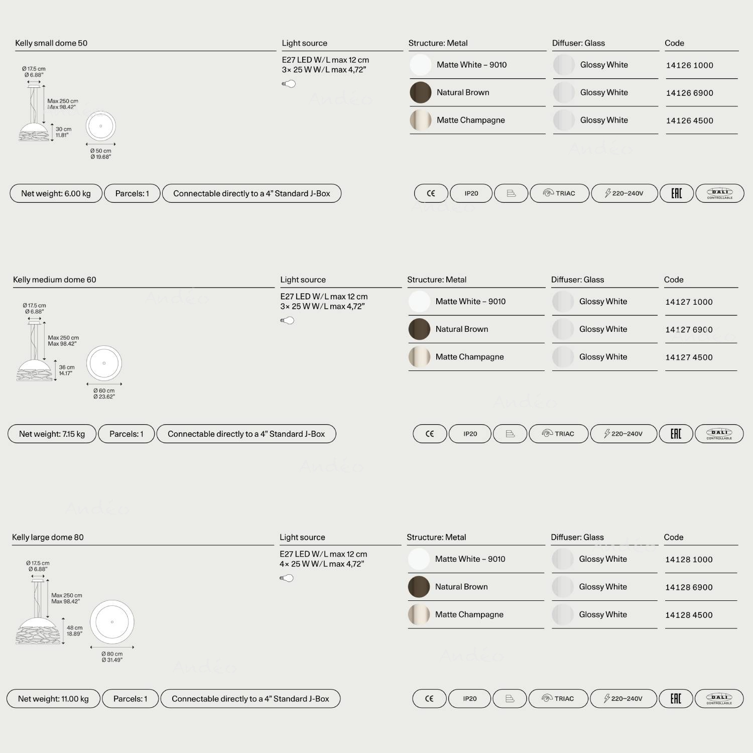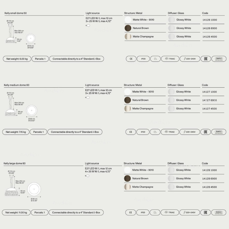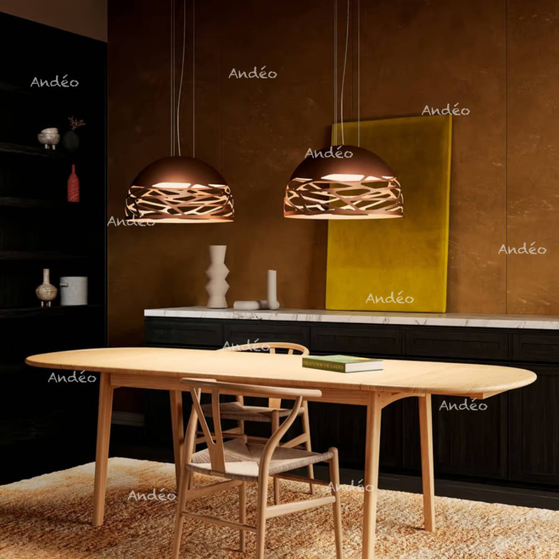 Lodes herdefinieert de koepel met een originele en charmante stijl. Deze hanglamp is voorzien van een glazen reflector om de lampen te verbergen en een harmonieus licht te verspreiden. Deze hanglamp is beschikbaar in drie afmetingen: 50 cm, 60 cm en 80 cm, en wordt aangeboden in de kleuren Wit, Brons, Mat zwart en Champagne.
