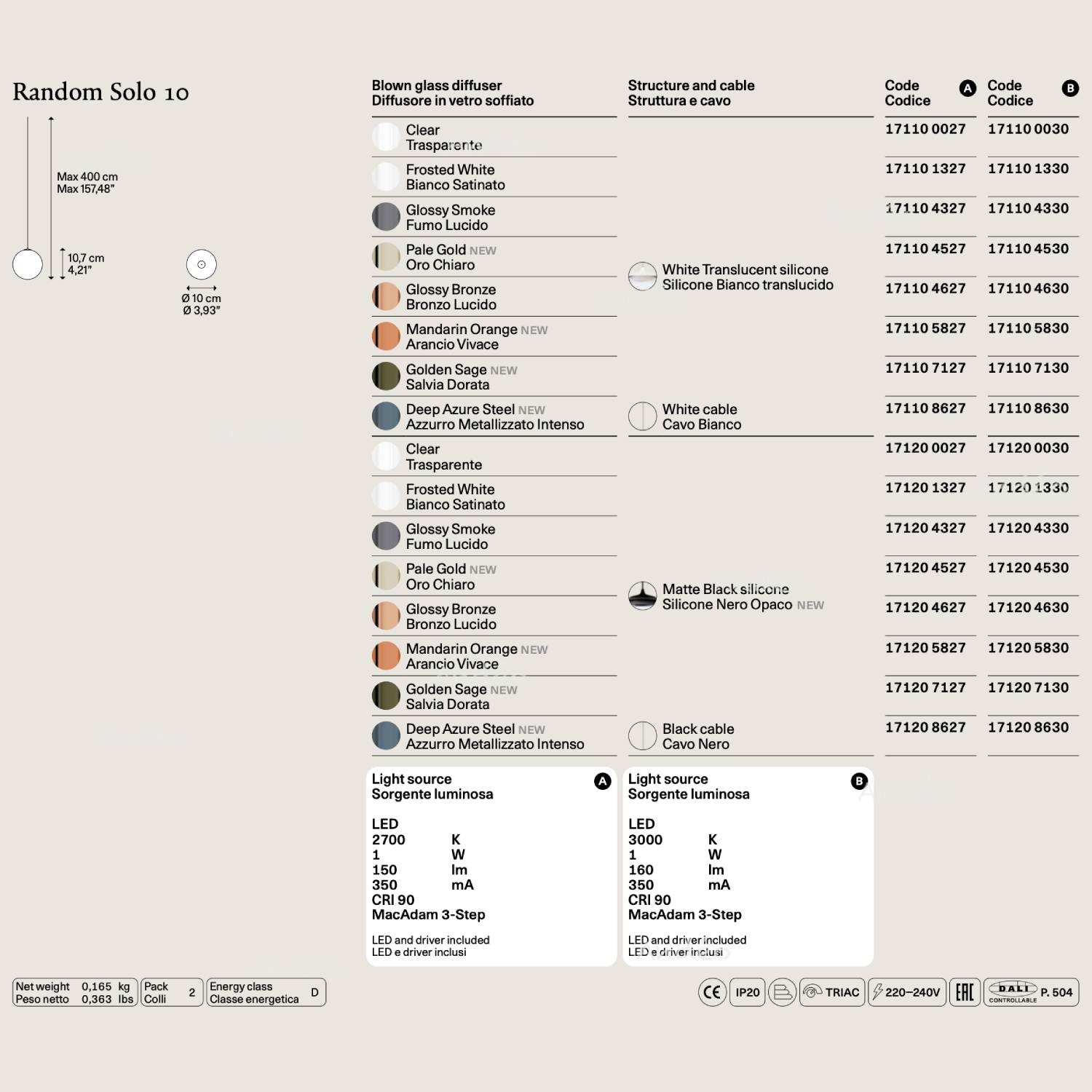 Random Solo is uitgerust met ledverlichting, verkrijgbaar in warm wit 2700°K en 3000°K. Deze is dimbaar met een Triac-compatibele schakelaar. (op aanvraag kabel van 10 m lengte)