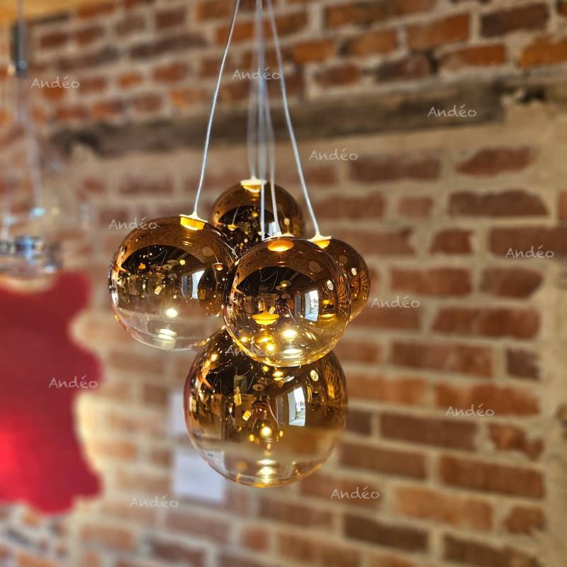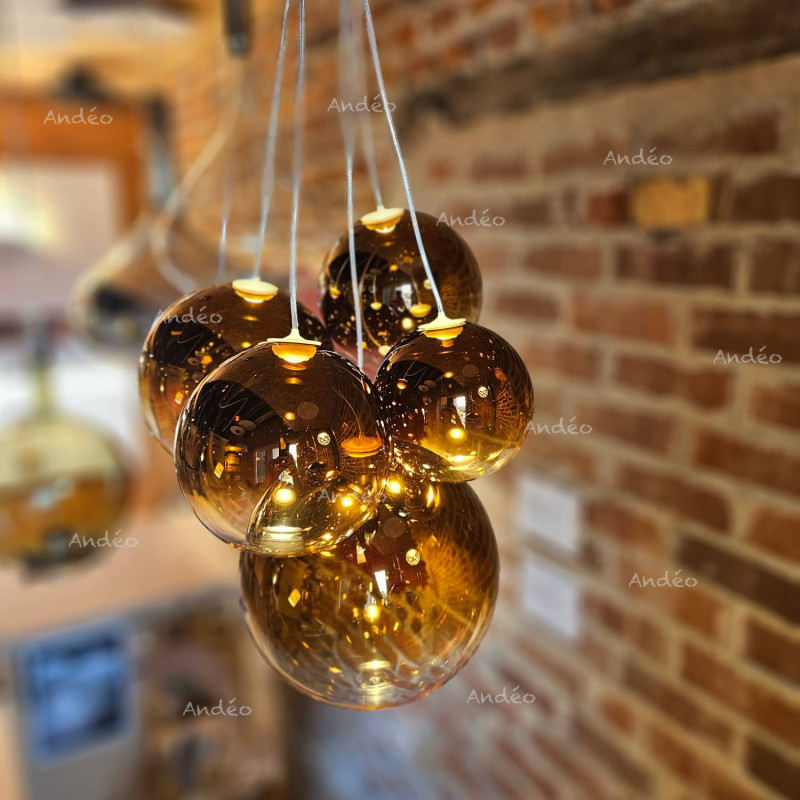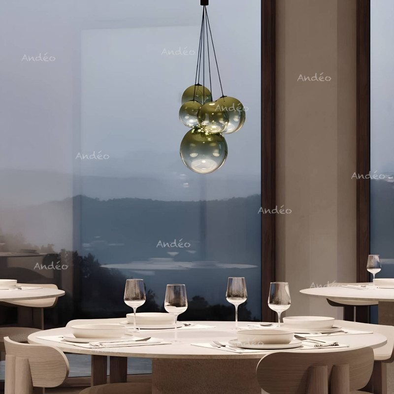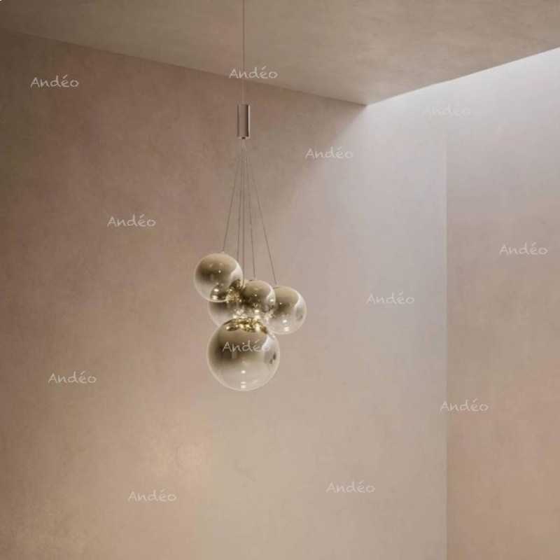 Lodes creëert met Random Five een design hanglamp met een luchtig karakter, samengesteld uit vijf bollen in geblazen glas die lijken te zweven in de ruimte. Deze compositie zorgt voor een licht en sculpturaal visueel effect, perfect om een eetkamer, een woonkamer met hoge plafonds of een inkomhal te verfraaien. De finesse van de kabels versterkt deze indruk van een zwevende hanglamp en geeft het geheel een elegante, hedendaagse en verfijnde uitstraling.