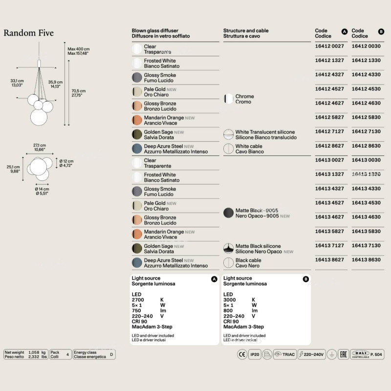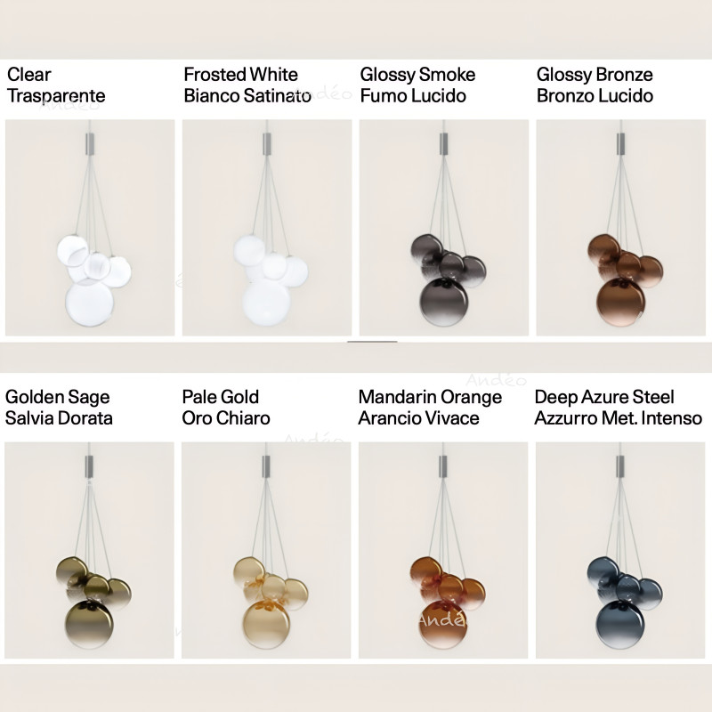Lodes Random Five is verkrijgbaar in verschillende glaskleuren: Clear, Frosted white, Glossy smoke, Pale Gold, Glossy Bronze, Mandarin orange, Golden sage en Deep azure steel. Bij deze hanglampen is de kleur van het glas sterk aanwezig aan de bovenzijde van de bol en lichter aan de onderzijde om het licht beter door te laten, met een mooi verloopseffect tussen beide.